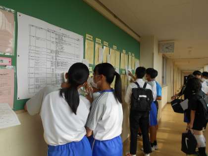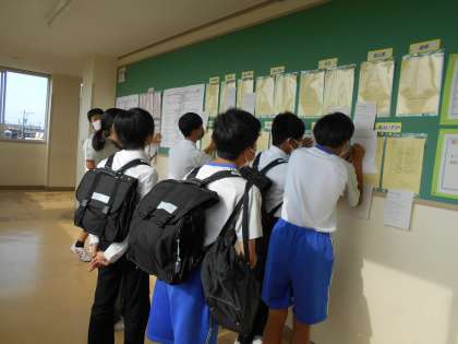 3年生の県立高校オープンハイスクールの申し込みに合わせて、掲示板の前で情報収集をしています。