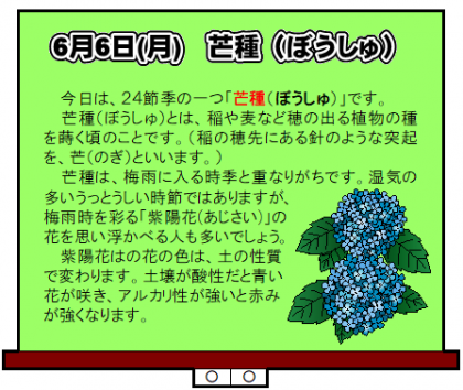 今日は「芒種(ぼうしゅ)」です! 公開日 2022/06/06 更新日 2022/06/06 山室中学校のページ 6月6日(月) 15:00 6月6日(月)から、24節気の「芒種(ぼうしゅ)」に入ります。 「立春」「大暑」「秋分」「冬至」などに比べると、「芒種」はなじみの薄い節気かもしれませんね。