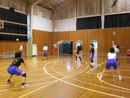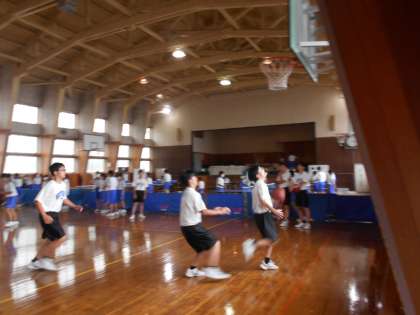 バドミントン部は、先輩、後輩が混じって打ち合いをしています。