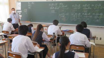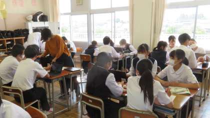 3年・授業風景 公開日 2022/06/10 更新日 2022/06/10 3学年 6月10日(金) 3限 気温は23度、天気は晴れ。 昨日よりは少し気温が高いので、蒸し暑く感じます。 少し疲れがたまってきていますが、授業に集中しています。 (写真 上:3年3組 理科の授業) (写真 中:3年4組 社会の授業) (写真 下:3年6組 数学の授業)