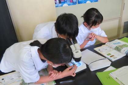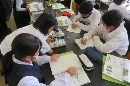 1年3組の理科は、第3理科室で、シダ植物のからだのつくりを学習しています。
