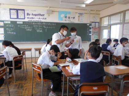 教育長等訪問・その8 公開日 2022/06/16 更新日 2022/06/16 2学年 6月16日(木) 3限 【2年3組:数学 連立方程式】 連立方式をいろいろな方法で解きます。 これまで習ったどの方法を使えばよいかな?