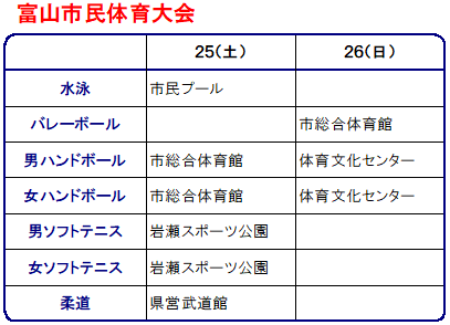(25日、26日に行われる各競技の会場は、下表のとおりです。)