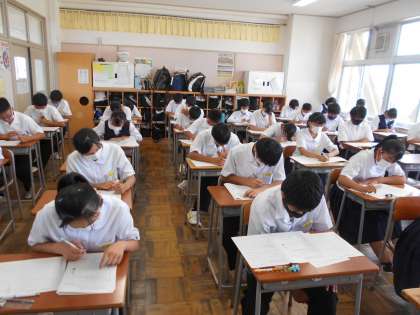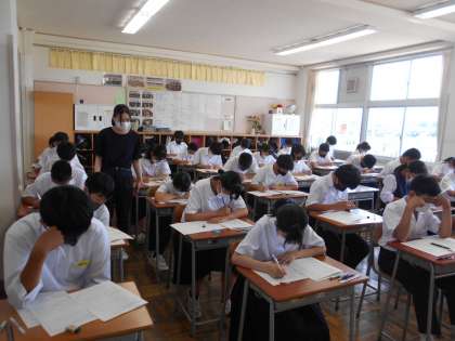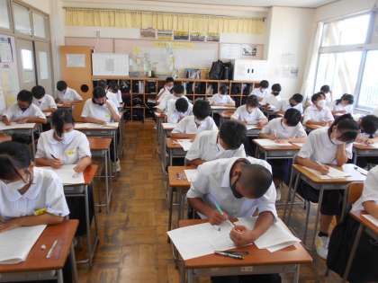2年・第1回 定期考査・3日目 公開日 2022/06/29 更新日 2022/06/29 2学年 6月29日(水) 1限 英語 外は暑いですが、教室はクーラーが入っていて快適です。 定期考査3日目も集中しています。 (写真 上:2年1組 中:2年2組 下:2年3組)