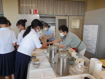 6月30日(木) 16:30 茶道部は、指導の先生方が3名来られ、基本的な道具の使い方を教えてもらっています。