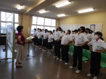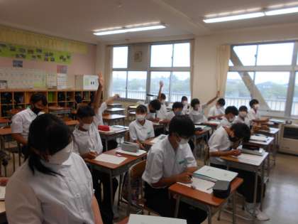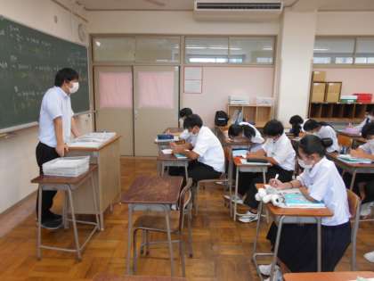 1年・授業風景 公開日 2022/07/04 更新日 2022/07/04 1学年 7月4日(月) 2限 (写真:上) 1年1組の音楽は、腹式呼吸を学んでいます。 お腹に手を当てて、実際に空気を吸ったり吐いたりしています。 (写真:中、下) 1年2組の数学は、累乗の表し方について学習しています。 少人数での学習なので、質問しやすく、先生とのやりとりも活発に行われています。