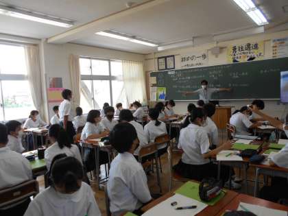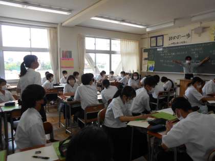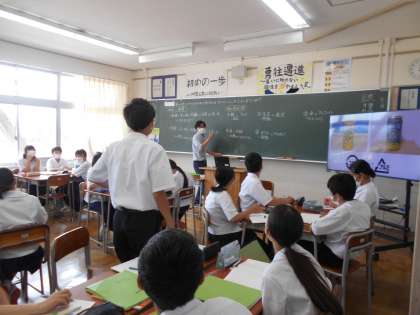 1年・理科・広がる話し合い 公開日 2022/07/06 更新日 2022/07/06 1学年 7月6日(水) 4限 1年3組の理科は、2つの物質の見分け方について、様々なアイディアを出し合っています。 生徒からどんどんアイディアが出て、黒板に板書されていきます。 視点がどんどん広がっていって、今後の理科の実験にもつながる視点が多く見付かりました。