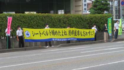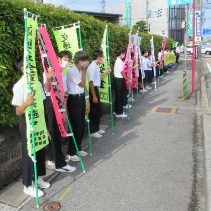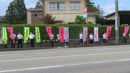交通安全「人波作戦」・その2 公開日 2022/07/13 更新日 2022/07/13 山室中学校のページ 7月13日(水) 7:40 山室中学校は、サイクル安全リーダーが参加しました。 来年は、さらに活動の輪を広げたいと思います。