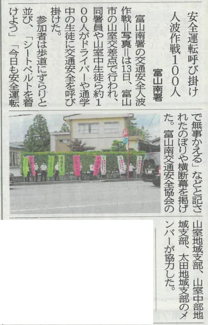 新聞記事に注目!! 公開日 2022/07/14 更新日 2022/07/14 山室中学校のページ 7月14日(木) 10:30 昨日13日(水)、交通安全「人波作戦」のようすが新聞で紹介されました。 ▼7月14日(木)付 富山新聞(22面)