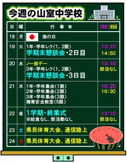 ♪今週の山室中学校♪ 公開日 2022/07/17 更新日 2022/07/23 お知らせ 7月17日(日) 10:00 1学期最後の週になりました。 22日(金)は、「1学期・終業式」です。 1学期をしっかり締めくくり、夏休み・2学期につなげていきましょう。