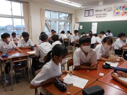 1年・学年レクリェーション 公開日 2022/07/19 更新日 2022/07/19 1学年 7月19日(火) 1限 1年は、教室で、放送を使った学年レクリェーションを行いました。 5月の宿泊学習のとき、時間が足りず行えなかったクイズを、そのときのサポート係が中心となって進めました。 生活班で仲良く答えを相談したり、ビンゴの集計に協力したりして、楽しいひとときを過ごしました。