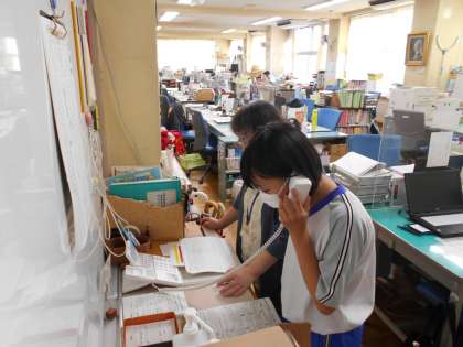 放課後の時間を利用して、「社会に学ぶ『14歳の挑戦』」に向けて、それぞれの事業所に事前訪問のアポイントメントをとる電話をしています。