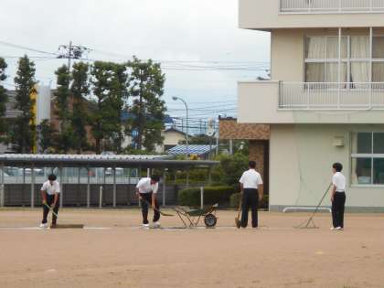 水たまりに砂を運んでならしたり、ラインを引いたり、ゴールを運んだり、………
