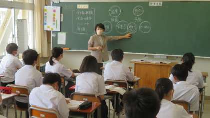 (写真 下:1年4組 英語の授業)