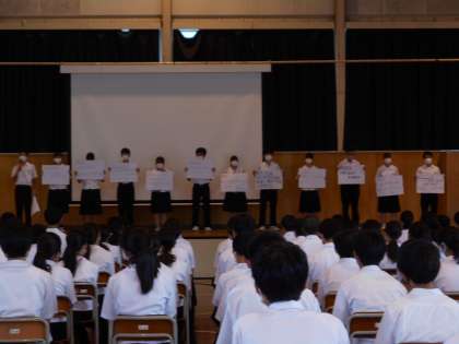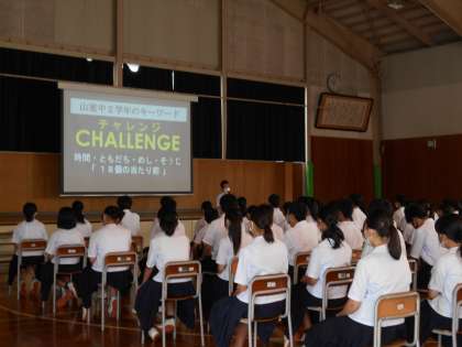 先生方からは夏休みの学習や生活、「社会に学ぶ『14歳の挑戦』」事前訪問についてのお話がありました。