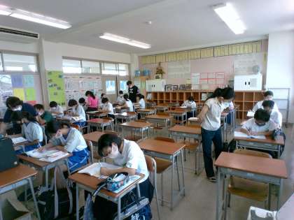 参加者は一生懸命、夏休みの課題に取り組み、分からないところを先生に質問しました。