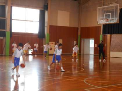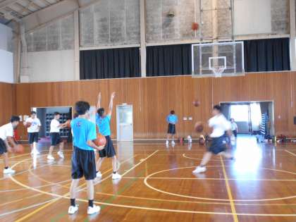 バスケットボール部は、女子はドリブルの基本練習(写真:上)、男子はシュート練習(写真:下)をしています。