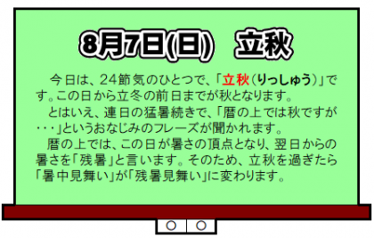 立秋は秋の始まりで、夏の暑さがピークに達し、秋に向け季節が移り変わり始める日という意味です。