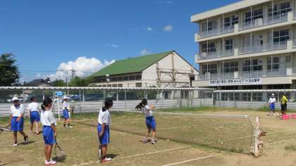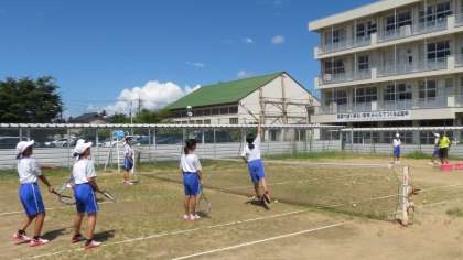 女子ソフトテニス部は、松下先生一緒にボレーの練習です。