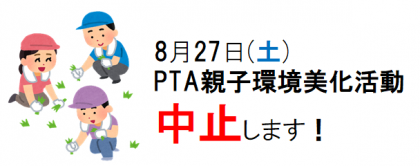 PTA親子環境美化活動は中止します! 公開日 2022/08/22 更新日 2022/08/22 お知らせ 8月22日(月) 17:00 新型コロナウイルス感染症が急速に拡大し、富山県でも連日、過去最多の感染者となり、「富山アラート」も9月6日まて延長となりました。 そこで、8月27日(土)に予定しておりました「PTA親子環境美化活動」は、新型コロナウイルスの感染拡大防止の観点から中止にします。 よろしくお願いいたします。