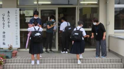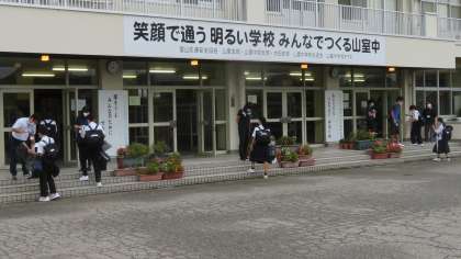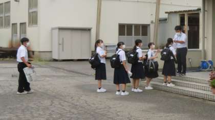 1,2年生・元気に登校! 公開日 2022/08/24 更新日 2022/08/24 山室中学校のページ 8月24日(水) 7:50 夏休み33日目、気温は24度、天気はくもり。 1,2年生は、学年登校日です。 生徒が続々と元気に登校してきました。(写真:上) (写真 中:1年生の検温のようす) (写真 下:2年生の検温のようす) 今日は、1,2年生とも「課題テスト」を行います。