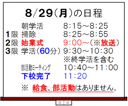 明日から、2学期がスタートします! 公開日 2022/08/28 更新日 2022/08/28 お知らせ 8月28日(日) 15:00 明日から、2学期がスタートします。 明日29日(月)の日程は、以下のとおりです。 (給食なし、部活動なし、午後放課)