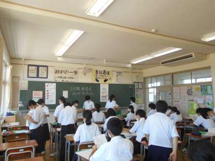 1年生は、放送による始業式に真剣に取り組んでいました。