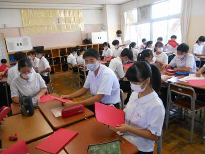 始業式後の学活では、合唱コンクールで歌うクラス曲の楽譜に表紙をつけています。(写真:上)