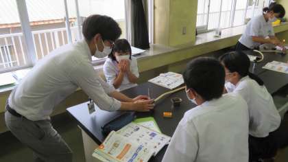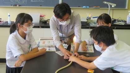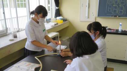 1年・理科・ガスバーナーの使い方 公開日 2022/08/30 更新日 2022/08/30 1学年 8月30日(火) 5限 1年3組の理科は、理科室で、ガスバーナーの使い方を学習しました。 まず、ガスバーナーを分解して、つくりやしくみを理解した上で、点火の練習です。 マッチの使い方も上手ですね!(写真:中)