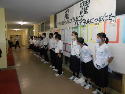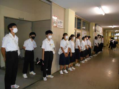 立候補者や応援生徒が玄関で元気に呼びかけをしています。