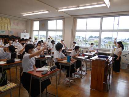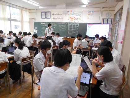 3年・授業風景 公開日 2022/09/02 更新日 2022/09/02 3学年 9月2日(金) 1限 (写真 上:3年1組) 国語は、俳句の鑑賞文を書くため、クロムブックを使って調べています。 (写真 中:3年3組) 社会は、合意形成の学習をしています。 自分たちでテーマについて話し合い、合意形成までいけるかな? (写真 下:3年4組) 英語は、英語の和訳をグループで行っています。 クロムブックで単語を調べながら進めます。