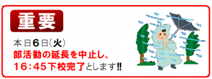 この状況を踏まえて、本校では、本日の部活動の延長を中止し、下校完了時刻を16:45に変更します。