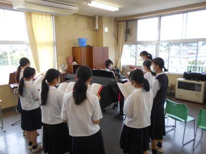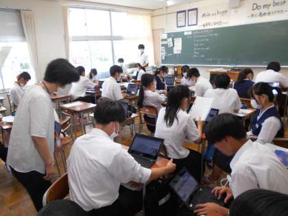 3年・授業風景 公開日 2022/09/07 更新日 2022/09/07 3学年 9月7日(水) 4限 (写真 上:3年3組) 音楽では、合唱コンクールの曲の音取りを各パートごとにやっています。 (写真 中:3年4組) 国語では、2つの批評文を比べながら、特徴について話し合っています。 (写真 下:3年5組) 英語では、クロムブックを使って英語の発音を確かめています。