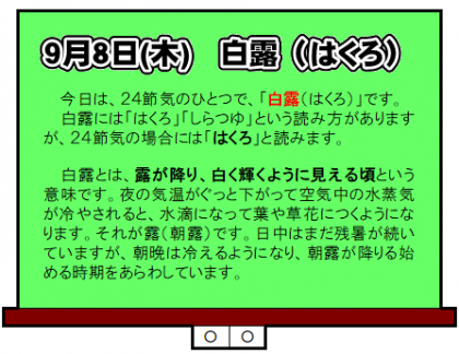 今日は、「白露(はくろ)」です。 公開日 2022/09/08 更新日 2022/09/08 山室中学校のページ 9月8日(木) 9:30 今日は、24節気のひとつ「白露」です。 秋を表す節気には、「立秋(りっしゅう)」「処暑(しょしょ)」「白露」「秋分(しゅうぶん)」「寒露(かんろ)」「霜降(そうこう)」の6つがあります。 「白露」は3つ目で、本格的な秋の訪れを感じさせるころです。