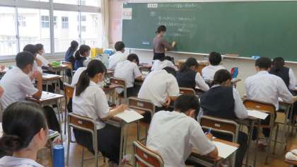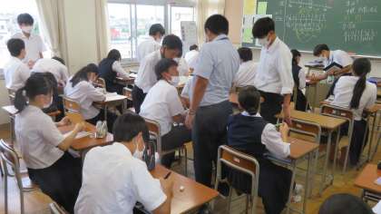 3年・授業風景・その2 公開日 2022/09/09 更新日 2022/09/09 3学年 9月9日(金) 3限 「学習の秋」 今週1週間は、長かったですか?短かったですか? (写真 上:3年3組 理科「等速直線運動」) (写真 中:3年4組 社会「2つの憲法の違い」) (写真 下:3年6組 数学「2次関数」)