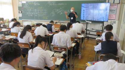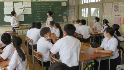 (写真 下:3年6組 英語 〜ALTとともに〜)