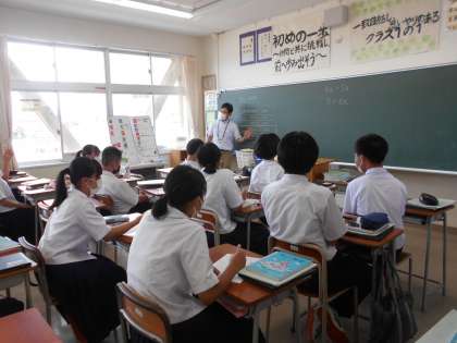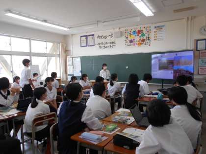 1年・授業風景 公開日 2022/09/13 更新日 2022/09/14 1学年 9月13日(火) 3限 数学は、文字式の解き方について少人数教室で教わっています。 (写真 上:1年1組) 社会は、高地の暮らしについて、各自が調べたことを発表しています。 (写真 中:1年2組) 社会は、平安時代の暮らしについてモニターを見ながら学習しています。 (写真 下:1年4組)