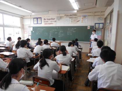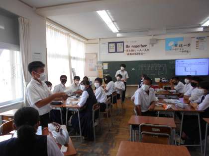 2年・授業風景 公開日 2022/09/13 更新日 2022/09/14 2学年 9月13日(火) 3限 道徳では、討論型の話し合いをしています。 「あなたはどちらの考えに近いですか?」 (写真 上:2年2組) 道徳では、各班で考えをまとめて発表しています。 発表者の意見にしっかりと耳を傾けています。 (写真 中:2年3組) 数学では、1次関数の解き方について、友達と話し合ったり先生に質問したりして解決しています。 (写真 下:2年4組)