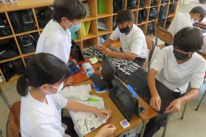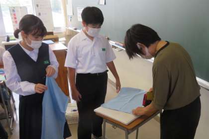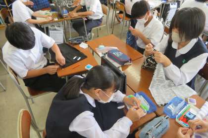 1年・家庭科・MYファイルカバーづくり 公開日 2022/09/14 更新日 2022/09/14 1学年 9月14日(水) 3限 1年2組の家庭科は、MYファイルカバーづくりです。 かがり縫いが終わると、三つ折りし、先生にアイロンがけをしてもらいます。(写真:中) みんな真剣にがんばっています!