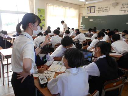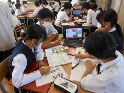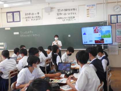 教育実習生・研究授業・その2 公開日 2022/09/14 更新日 2022/09/14 1学年 9月14日(水) 5限 教育実習生の社会の研究授業が1年5組で行われました。 「5つの気候帯を衣食住の視点で紹介しよう。」を課題に、クロームブックや資料を使いながらグループで話し合っています。 みんな課題について、真剣に議論していていいですね!