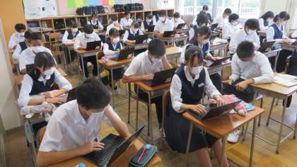 (写真 下:3年6組 社会「差別と偏見」クロムブックを使って)