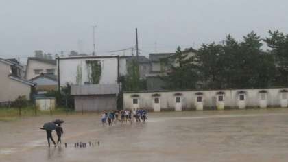 グラウンドでは、大雨の中、駅伝部だけが練習しています。