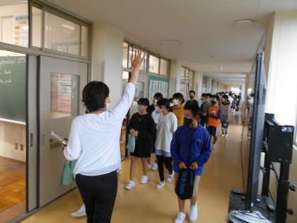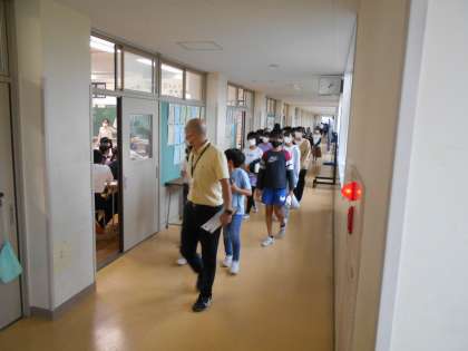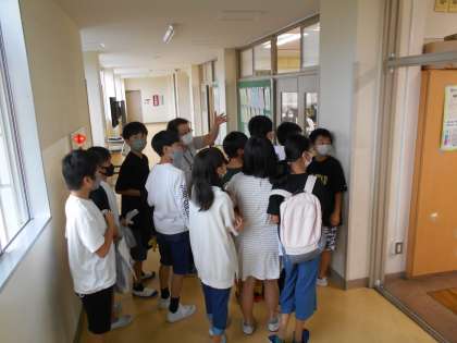 統一学校公開日・その2 公開日 2022/09/23 更新日 2022/09/23 山室中学校のページ 9月23日(金) 14:00 後半は、保護者に向けて学校概況の説明、生徒指導、教育相談の話をしました。 6年生は、学校見学を行いました。(写真) 中学校の先生方に引率されて、興味津々で授業の様子を見ていました!