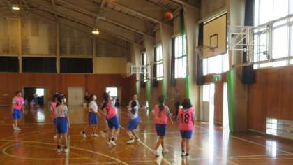 2年1,2組の体育は、男子がグラウンドでソフトボール(写真:上)、女子は体育館でバスケットボール(写真:下)をしています。