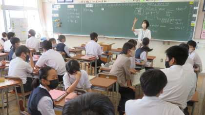 (写真 下:2年5組 英語の授業)