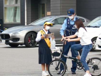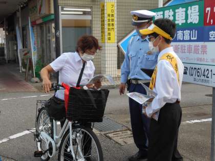 サイクル安全リーダー・交通安全呼びかけ 公開日 2022/09/26 更新日 2022/09/26 生徒会活動 9月26日(月) 16:15 9月21日(水)〜9月30日(金)まで、「秋の全国交通安全週間」です。 これに合わせて、富山南警察署と協力し、本校のサイクル安全リーダーが、南富山駅周辺で自転車を利用する方々に、チラシを配ったり、「気を付けて〜!」と一声掛けたりしながら活動しました。