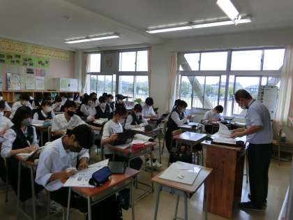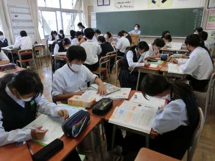 1年・授業風景・その1 公開日 2022/09/27 更新日 2022/09/27 1学年 9月27日(火) 2限 英語では、主語によって変わるbe動詞について、替え歌を歌いながら覚えています。 (写真 上:1年1組) 技術では、金属の特性について学習しています。 (写真 中:1年2組) 理科では、水溶液の濃度を求める計算に悪戦苦闘中です。 グループで助け合いながら問題を解いています。 (写真 下:1年3組)