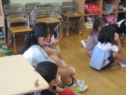 2年・14歳の挑戦・1日目・その3 公開日 2022/09/27 更新日 2022/09/27 2学年 9月27日(火) 11:20 「社会に学ぶ『14歳の挑戦』」の活動を紹介します。 「わかば福祉会 石金こども園」での活動のようすです。 園児と一緒に、真剣に先生の話を聞いています。 園児から憧れられるかっこいいお兄さん、お姉さんでありたいですね。