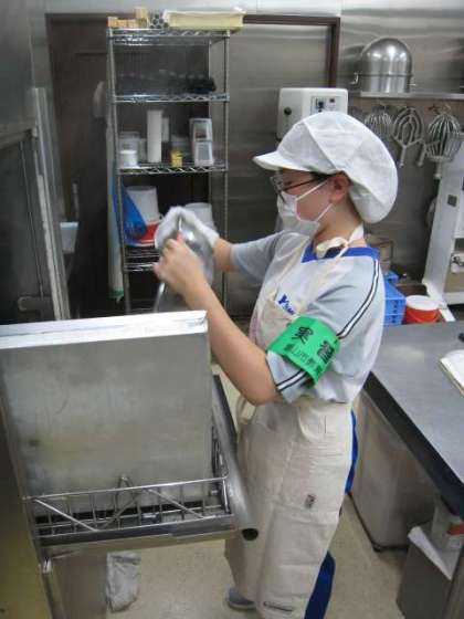 お菓子の袋にシールを貼ったり、器材を洗ったりしていました。