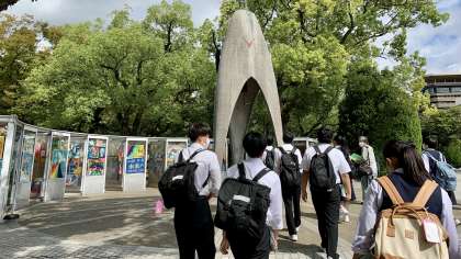 3年・修学旅行・2日目・その9 公開日 2022/09/28 更新日 2022/09/28 3学年 9月28日(水) 11:00 平和セレモニーのあと、各班に別れてボランティアガイドさんと一緒に碑めぐりをしました。 みんな真剣な眼差しで話を聞いています。